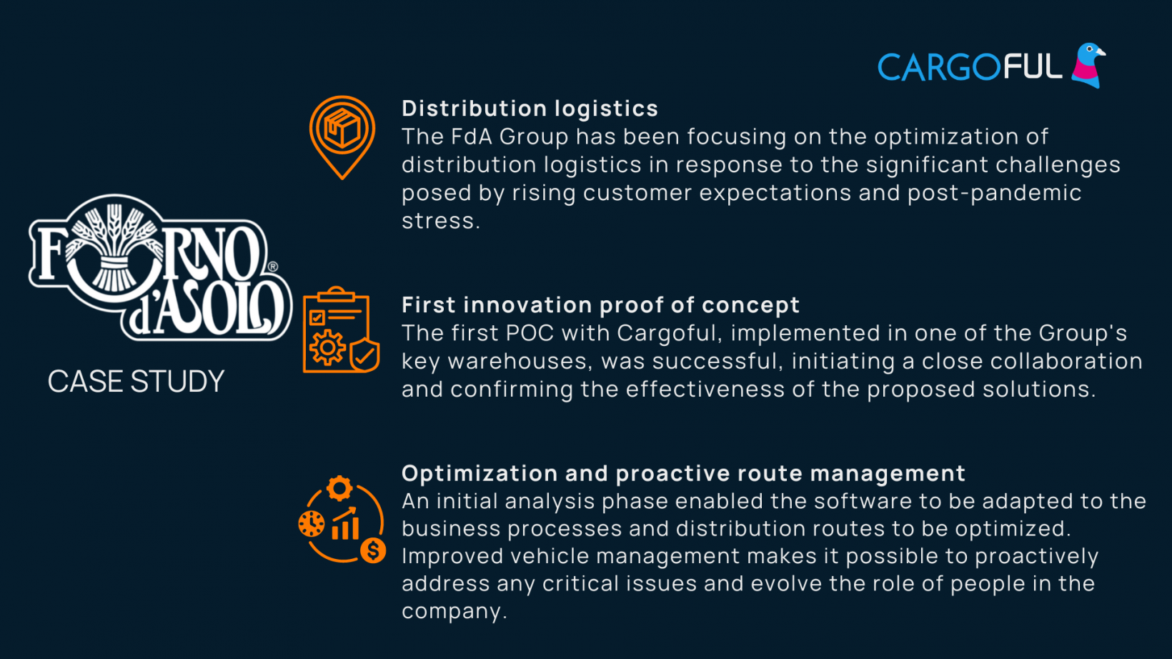 "Together with Cargoful, we embarked on a journey to improve service, information management and punctuality through accurate monitoring and planning. Their start-up nature proved to be an added value, responding positively to our needs and confirming the crucial role of technology at the service of people." - Giovanni Vozza, Distribution Manager, FdA